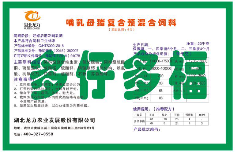 湖北龍力農(nóng)業(yè)發(fā)展股份有限公司坐落于武漢市黃陂區(qū)前川街向陽街群順三里298號附1號。公司成立于2014年6月,公司自成立以來把“創(chuàng)全球最大養(yǎng)豬綜合服務(wù)”為企業(yè)愿景。致力于打造教保料品牌”作為公司發(fā)展的明確目標。公司一直致力于豬營養(yǎng)的研究和開發(fā),積極與國內(nèi)外高校和科研機構(gòu)合作,推廣養(yǎng)豬技術(shù)、動物營養(yǎng)新概念,向世界農(nóng)牧企業(yè)學習與合作。公司采用國內(nèi)先進的生產(chǎn)工藝,選擇高精度電子配料秤,高均勻度、無殘留混合機等先進設(shè)備....
